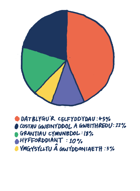 Yn y cyfamser, mae’r celfyddydau a diwylliant; sef rhai o'n cryfderau mwyaf yn cael eu tanariannu a'u tanbrisio. Mae Cymru ymhlith y gwledydd isaf yn Ewrop o ran buddsoddiad cyhoeddus mewn diwylliant. Mae artistiaid sy'n dod i'r amlwg yn cael trafferthion wrth geisio dod o hyd i ofodau, cefnogaeth neu welededd. Ac eto creadigrwydd yw un o'r grymoedd mwyaf pwerus sydd gennym i gyflwyno gobaith, cysylltiad a newid.